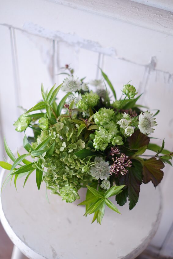 全体を緑系の色でまとめ、小花やミニバラを使い、素朴でやさしい雰囲気に