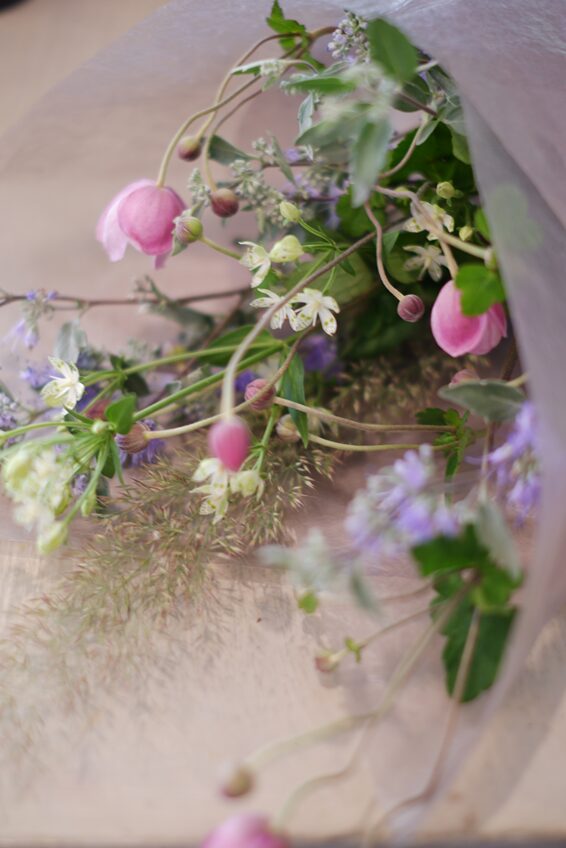 「秋明菊が似合いそう」とのことで、曙草やダンギクを合わせて束ねました