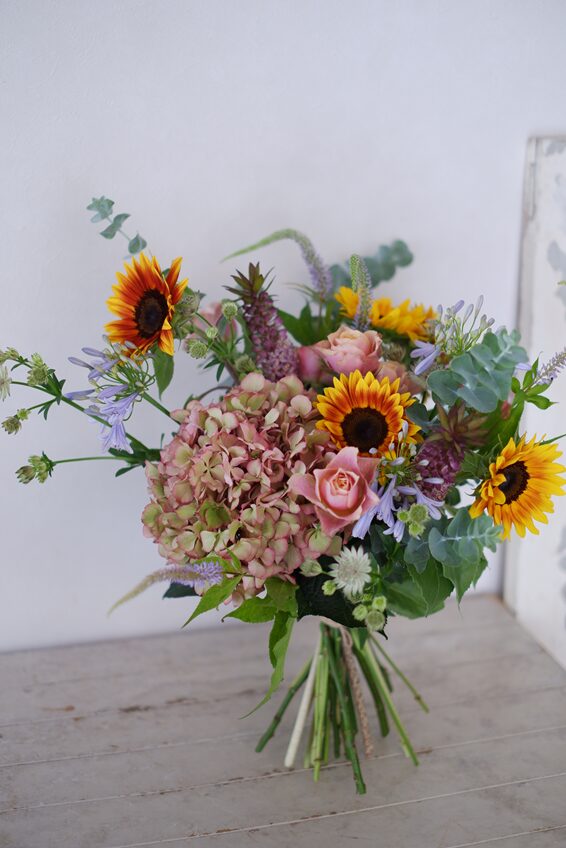 ひまわり「サンリッチマロン」のほか、ピンクのアンティークカラーの紫陽花、バラ「テーブルフォートゥー」、ラベンダー色のクガイソウやアガパンサスなど、さまざまな色の花を束ねました💐