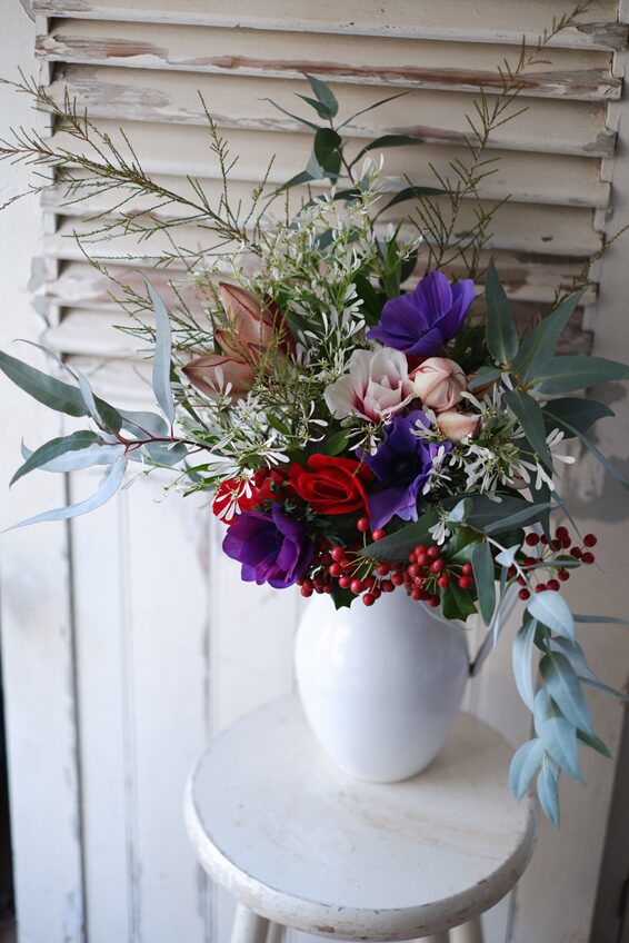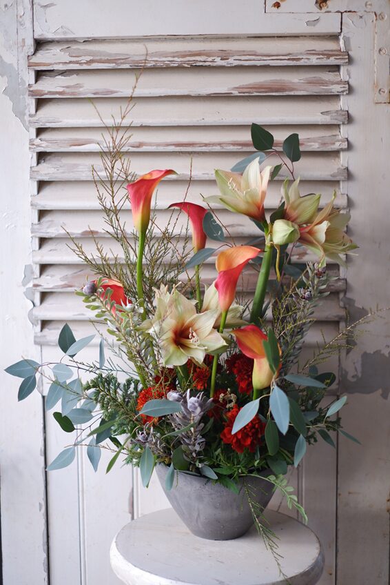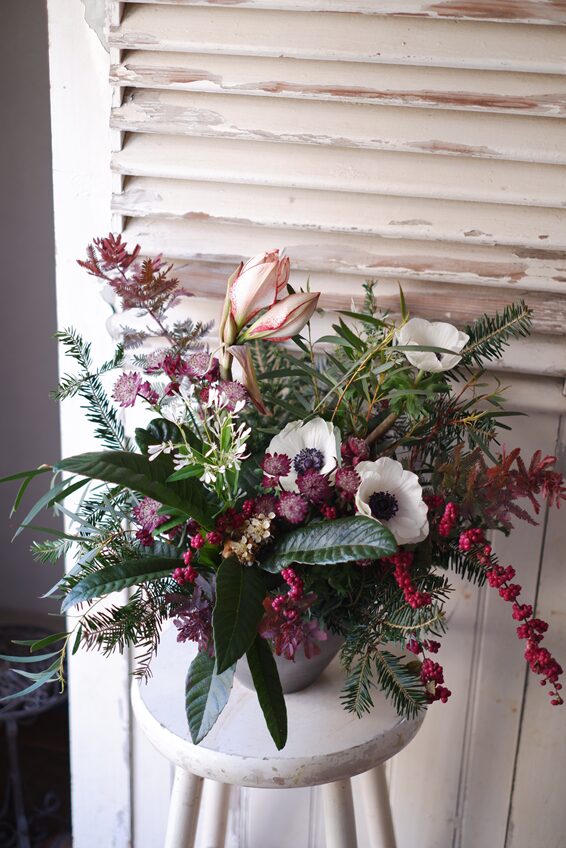クリスマスまで楽しんでいただけるよう、花持ちの良いアマリリスをポイントに、アネモネやモミの枝を合わせています🎄