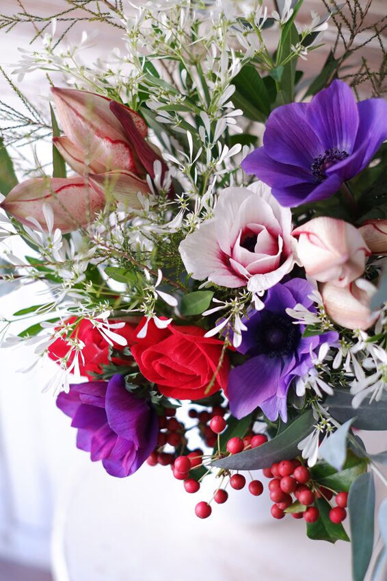 今日は、季節のアマリリスやアネモネを使った、アレンジメントと花束をご紹介します