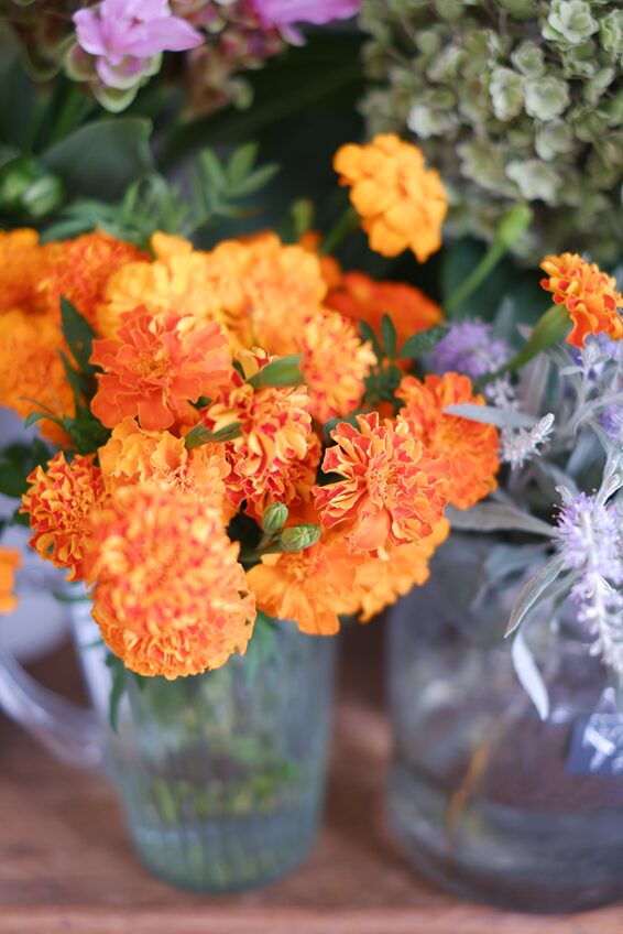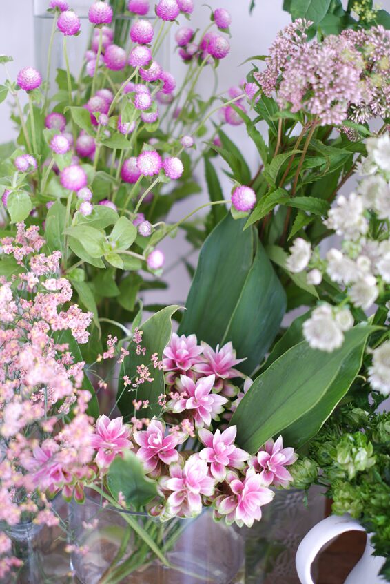 今週は、マリーゴールドやガーベラ、サンタンカ、バラ、ケイトウ、クルクマなどを、ピンクやオレンジ中心に仕入れてみました