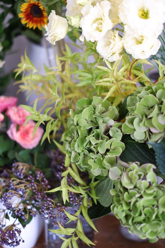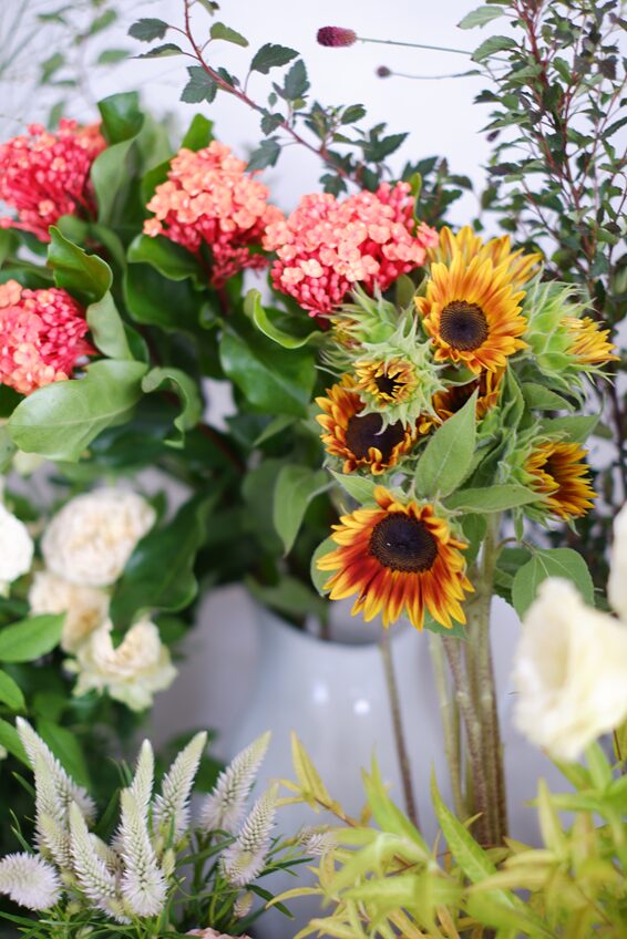 茶みがかったひまわりや吾亦紅、黄葉した丁子草、すずめうりなど、秋めいた花材ともよく合います