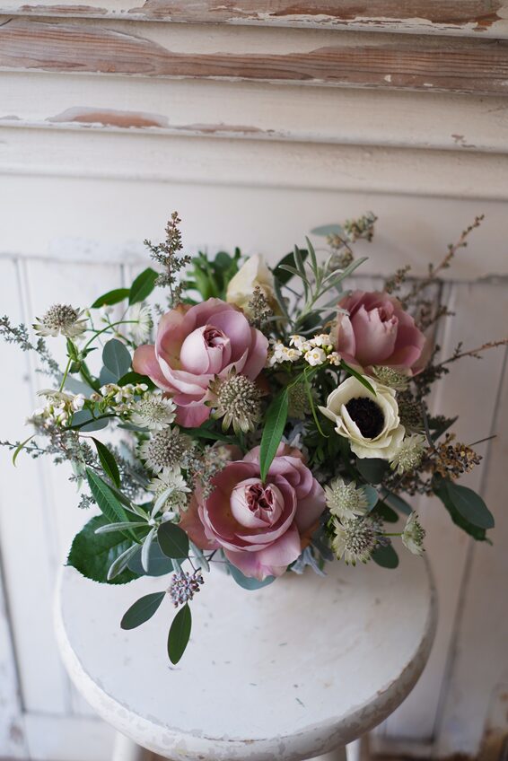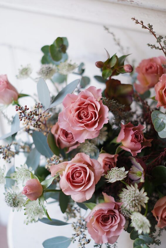 ベージュピンクのバラをご希望でも、クリスマスローズを合わせてみたり・・