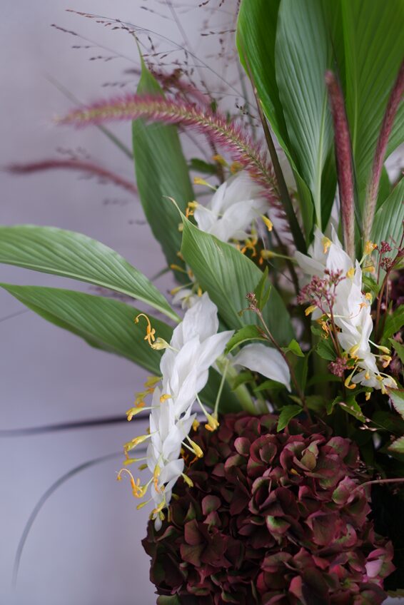 その日、市場で一目惚れしたグロッパ「ホワイトドラゴン」に、シックな臙脂色の秋色紫陽花を合わせて・・