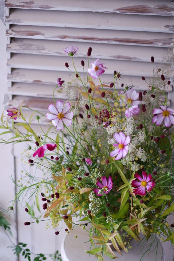 季節のコスモス、吾亦紅、ウドやフジバカマを添えて、秋の野山の趣を感じさせるアレンジに