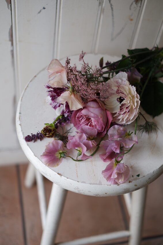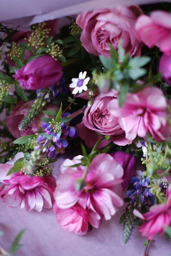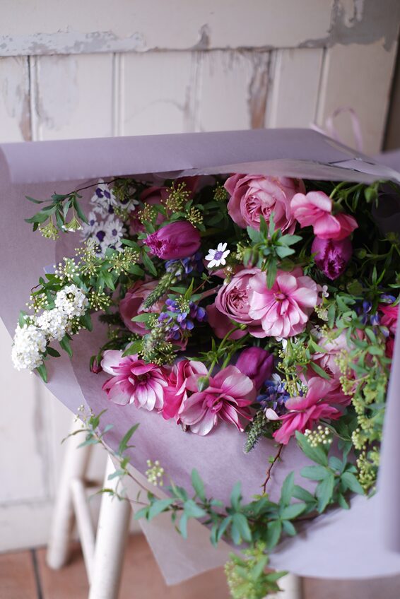 ニュアンスのある紫の草花を添えると、シックでやわらかな印象になりますね