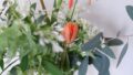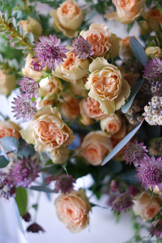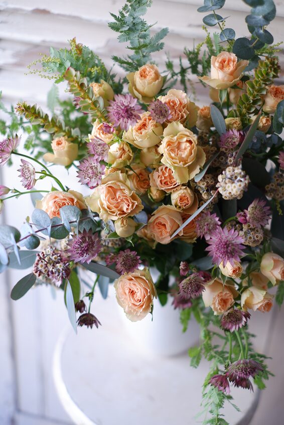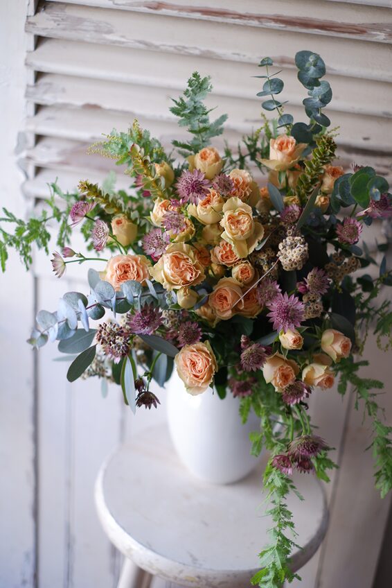 花付きユーカリやミモザアカシア、アストランチャなど、クラシカルな表情の花材を添えて・・