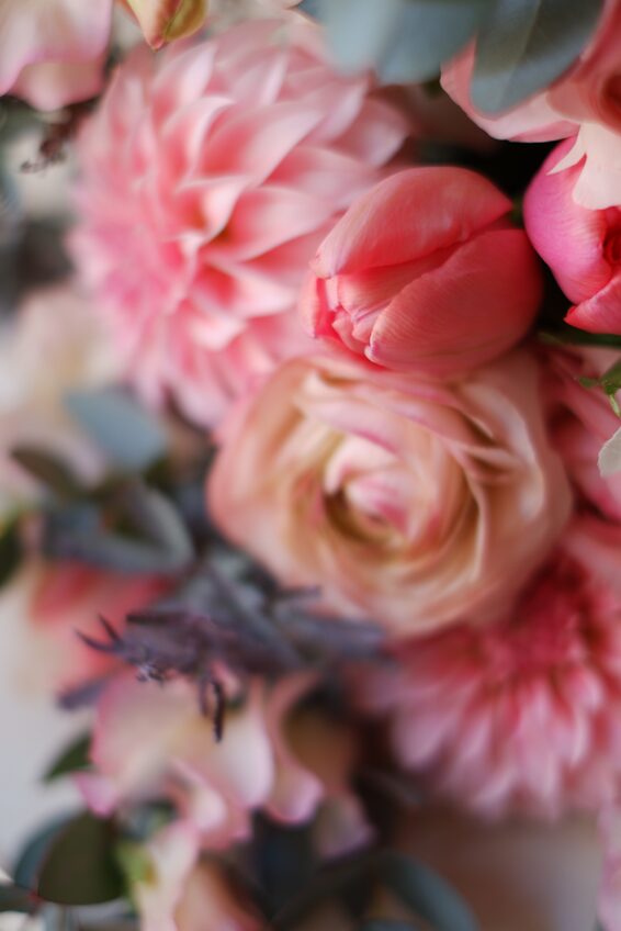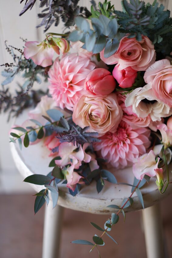 レストランでのお渡しとのことで、ピーチ系のやさしいピンクで、さりげなく華やかにおまとめしました
