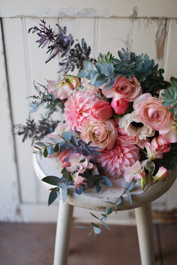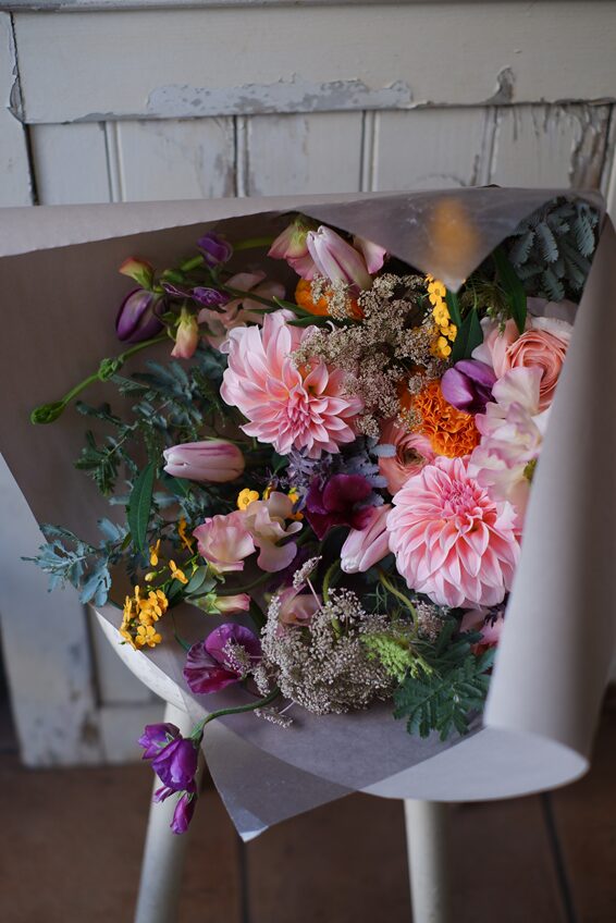 今日はもうひとつ、ダリア「ピーチロゼ」を入れた花束を