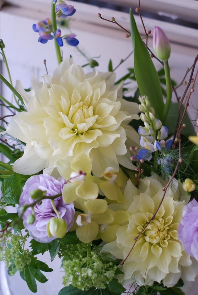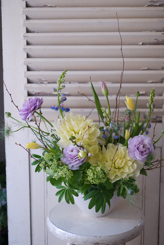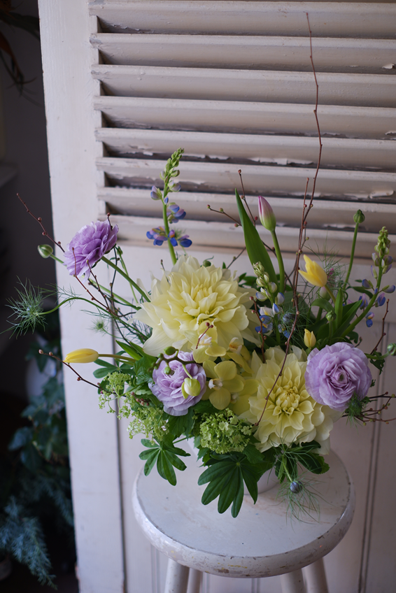 レモン色のダリア Diary 2025.02.24 春の花は透明感があって、一年で最もパステルカラーが美しい季節ですね レモン色の大輪ダリアにミニ胡蝶蘭、淡いブルーのルピナス、春色のチューリップを合わせたアレンジメントは、男性アーティストのバースデーコンサートにお届けしました
