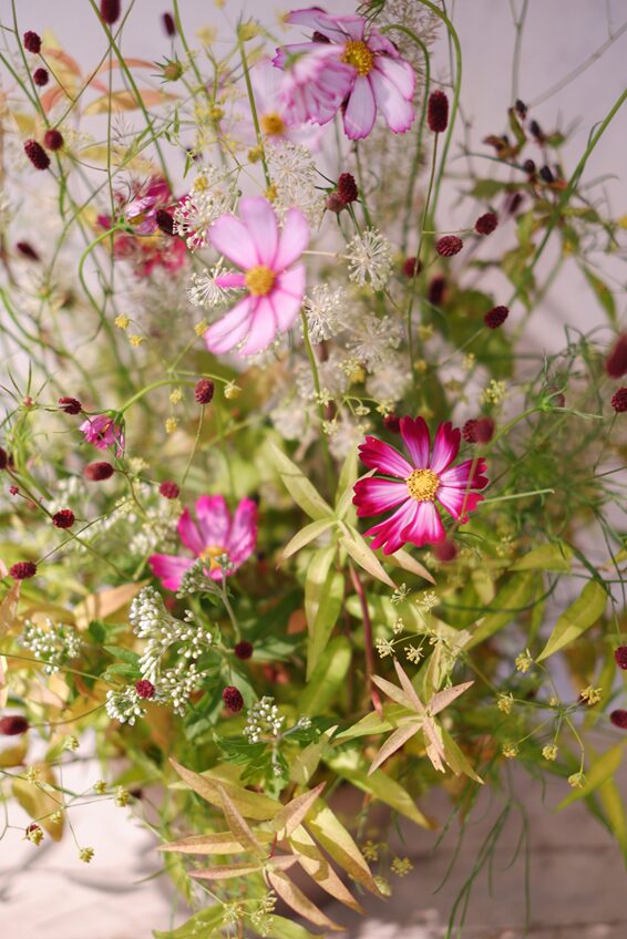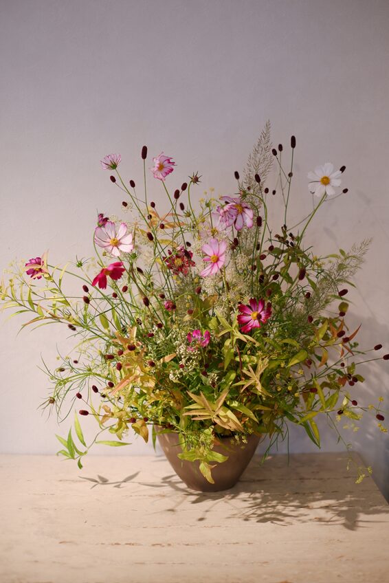 このアレンジは、最初に野の花たちで秋の景色をつくり、最後に主役のコスモスをそっとあしらって完成です