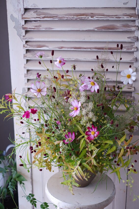 このアレンジは、最初に野の花たちで秋の景色をつくり、最後に主役のコスモスをそっとあしらって完成です