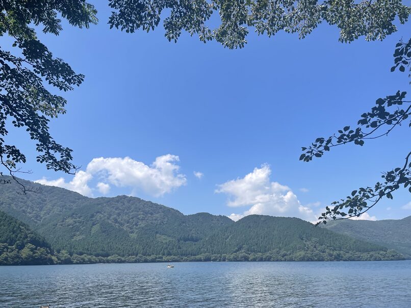 参拝を終えて湖畔へ出ると、空にはぽっかりと白い雲
