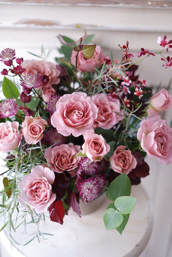 シュナーベルに合わせて、紅スモモの枝やオンシジューム、アストランチャなど、