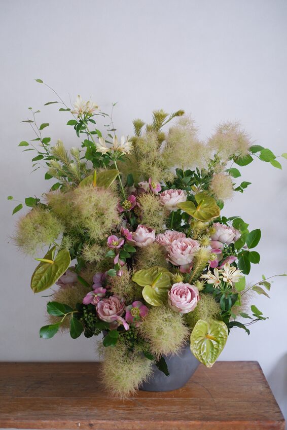 そこに季節のスモークツリーをたっぷりと添えてアレンジいたしました