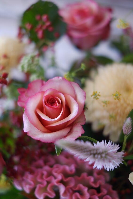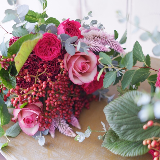 2種のバラに、ローズカラーのケイトウ、ガマズミの実を添えています