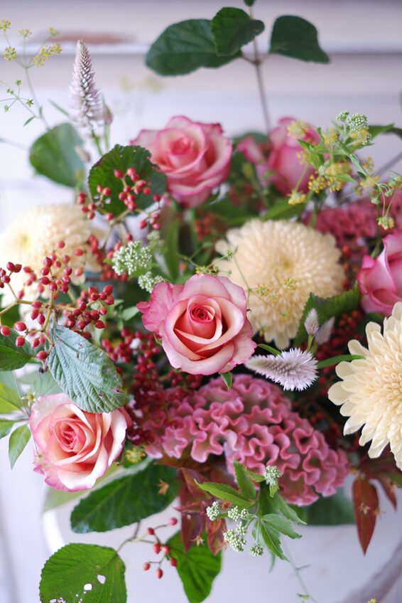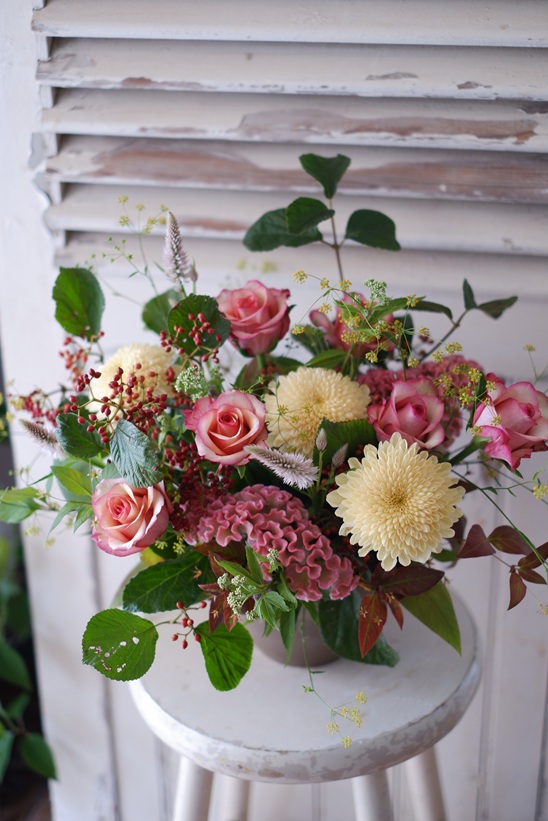 洋菊にバラ「ビンテージ」、ミシマサイコ、赤く色づいたガマズミの実をあしらいました