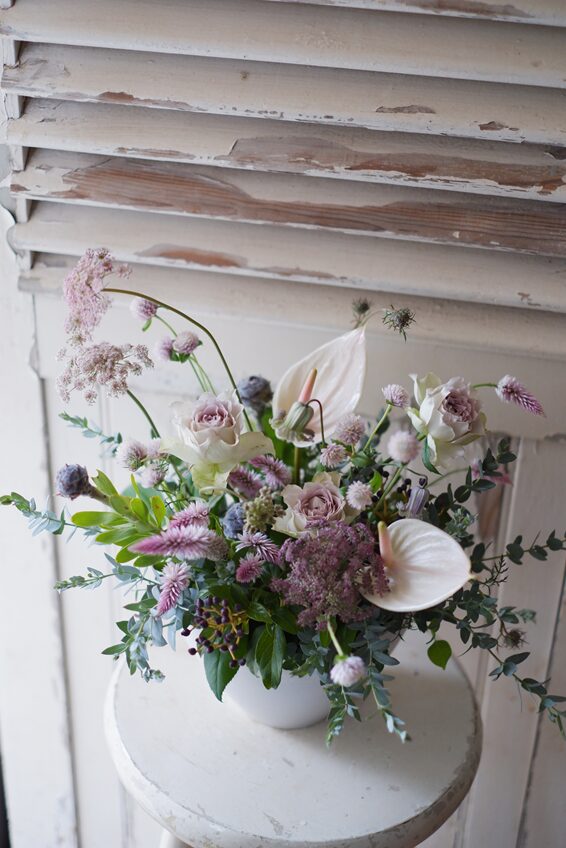 バラ「ラピスヴェール」に、チューリップ型のアンスリュームやセロシア、ビバーナムティヌスなど合わせました