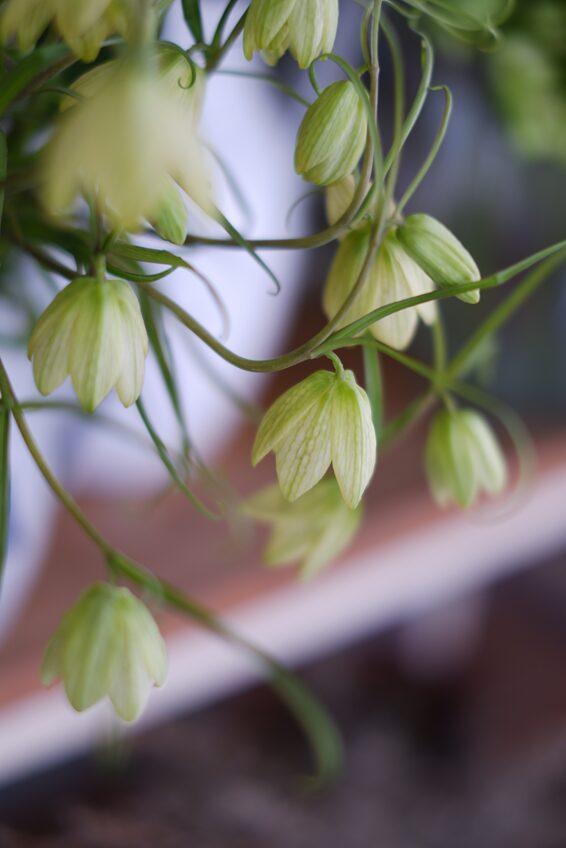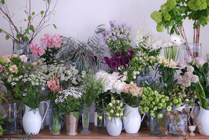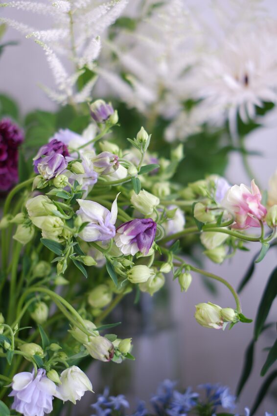 チューリップやラナンキュラスに代わって、オダマキやアリウム、カンパニュラなど、初夏の草花を選んできました