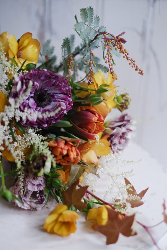 バラ「テナチュール」とミモザ、ラナンキュラスを束ねて