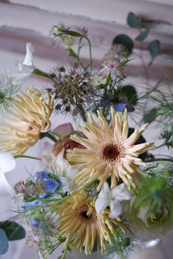 淡くやさしい色合いで束ねた結婚記念日の花束