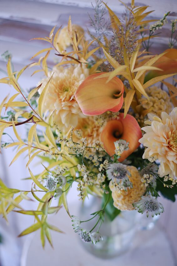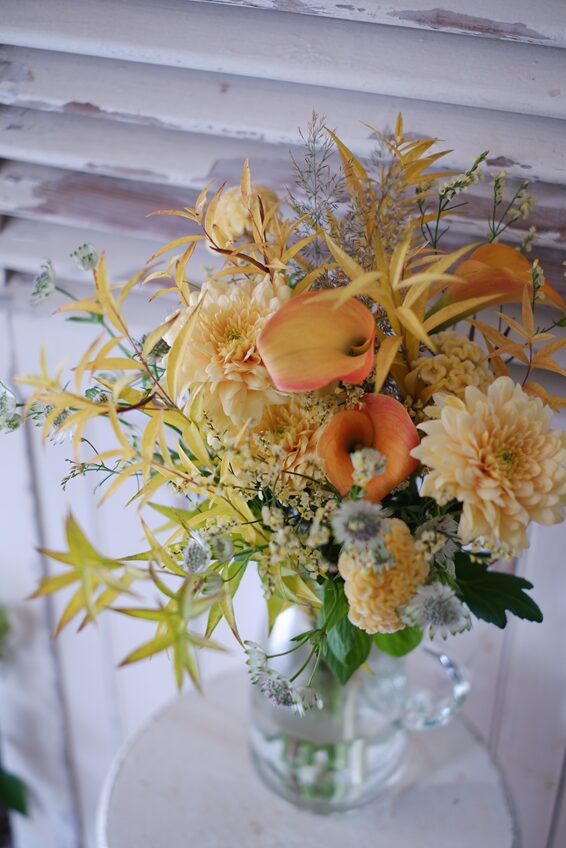 そこで今回は少し雰囲気を変えて、オレンジ寄りの黄色やクリーム色を中心に、菊とカラーをメインに選ばせていただきました