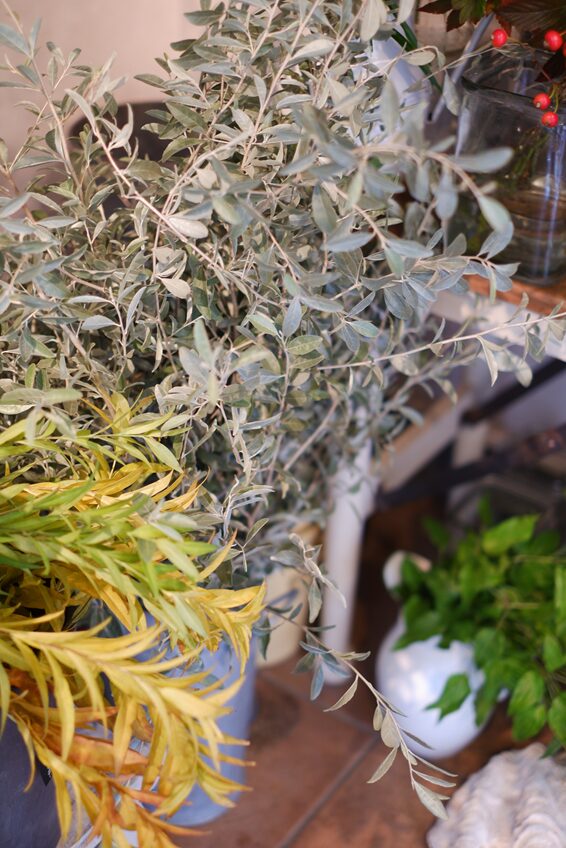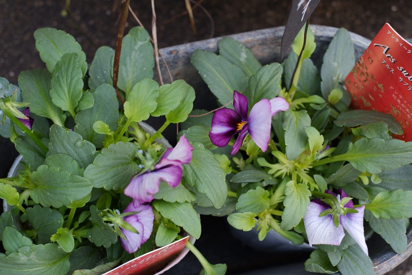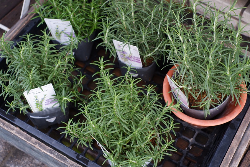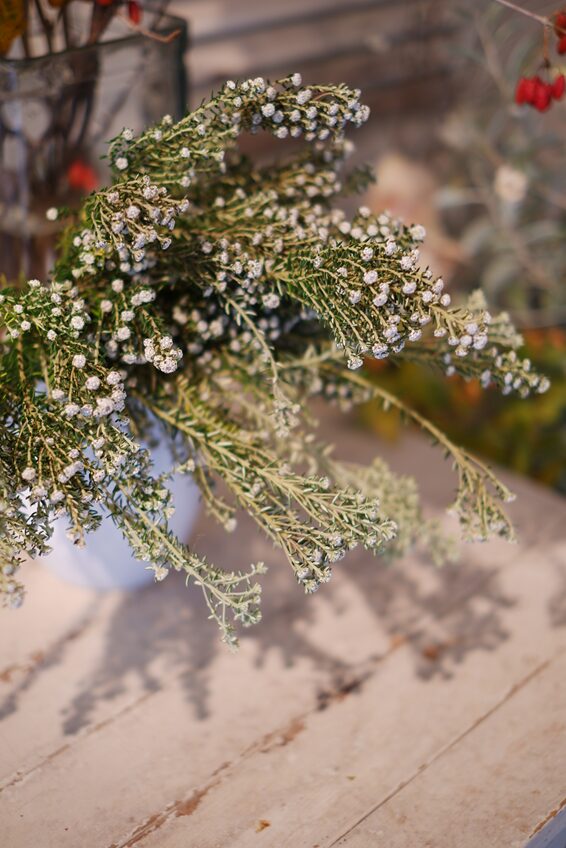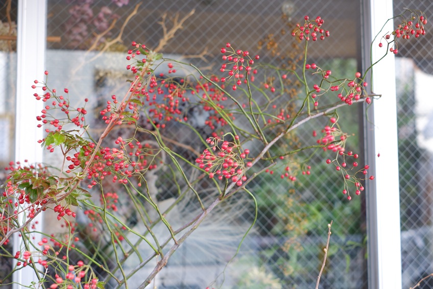 店頭には、真っ赤な野ばらの枝や、いろいろな品種のローズマリー、お気に入りのビオラなどを少しずつ仕入れていますよ