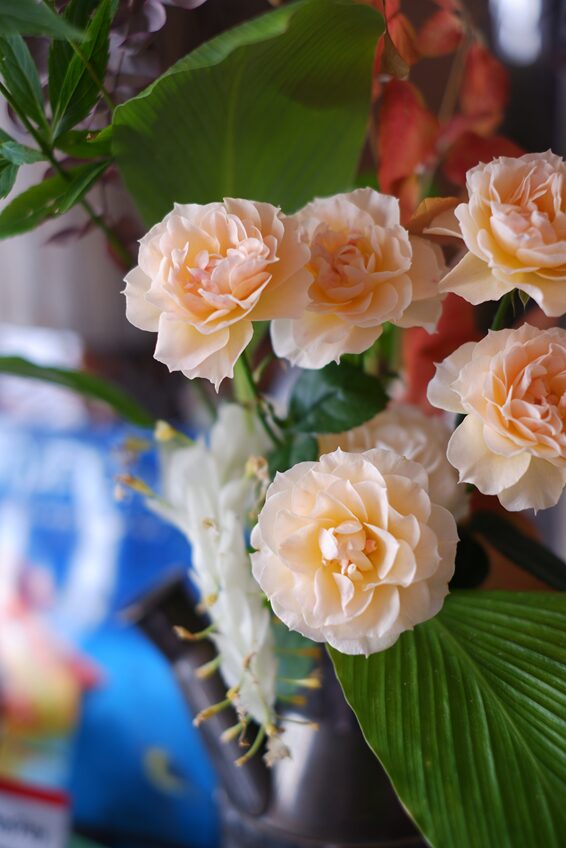 カウンターには、先週の残り花のバラ「渚」を飾って