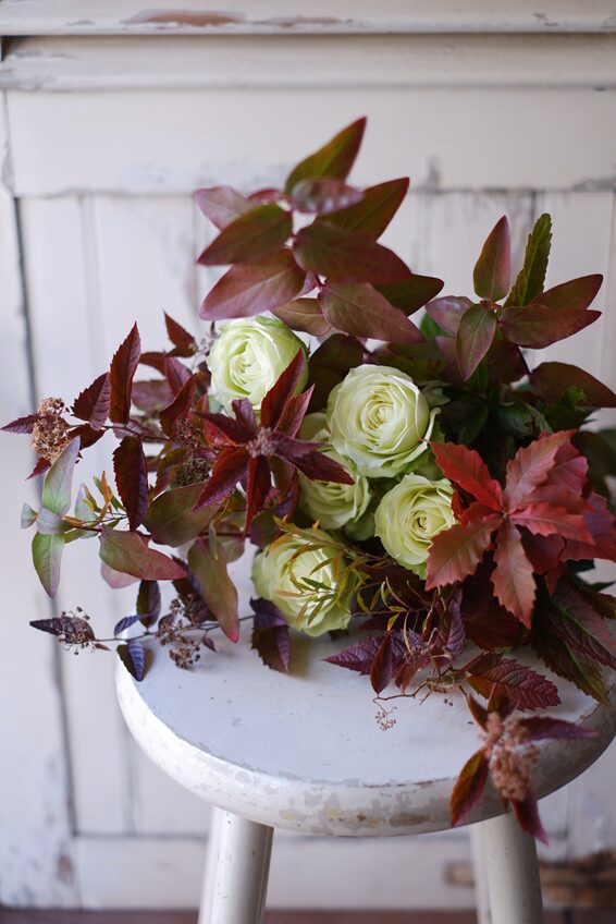 紅葉とグリーンローズ 今週のオークリーフ 2025.11.17 ヒペリカムやナラ、ユキヤナギなど、5種類の紅葉に、緑色のバラ「グリーンアロー」を合わせて 渋めの雰囲気がお好きな方のお誕生日に 季節の花束やアレンジ、入荷情報は「Diary」でご紹介しています