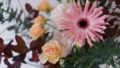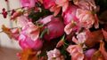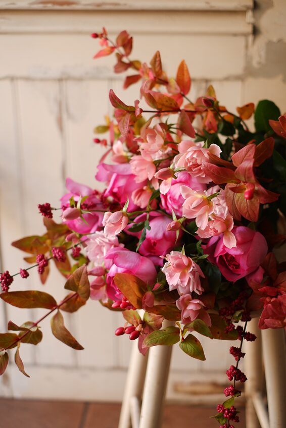 紅葉と秋バラの花束 今週のオークリーフ 2025.11.22 晩秋らしい、深い赤色に紅葉したヒペリカムや濃いピンク色の実物を添えて、美しい秋バラと束ねた、還暦祝いの花束 季節の花束やアレンジ、入荷情報は「Diary」でご紹介しています