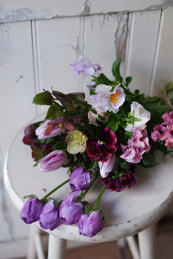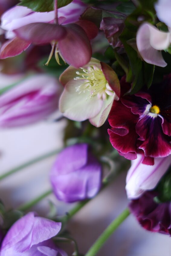 紫色のお花が大好きな方と伺い、ラナンキュラスやパンジー、クリスマスローズなどをさっと束ねて、