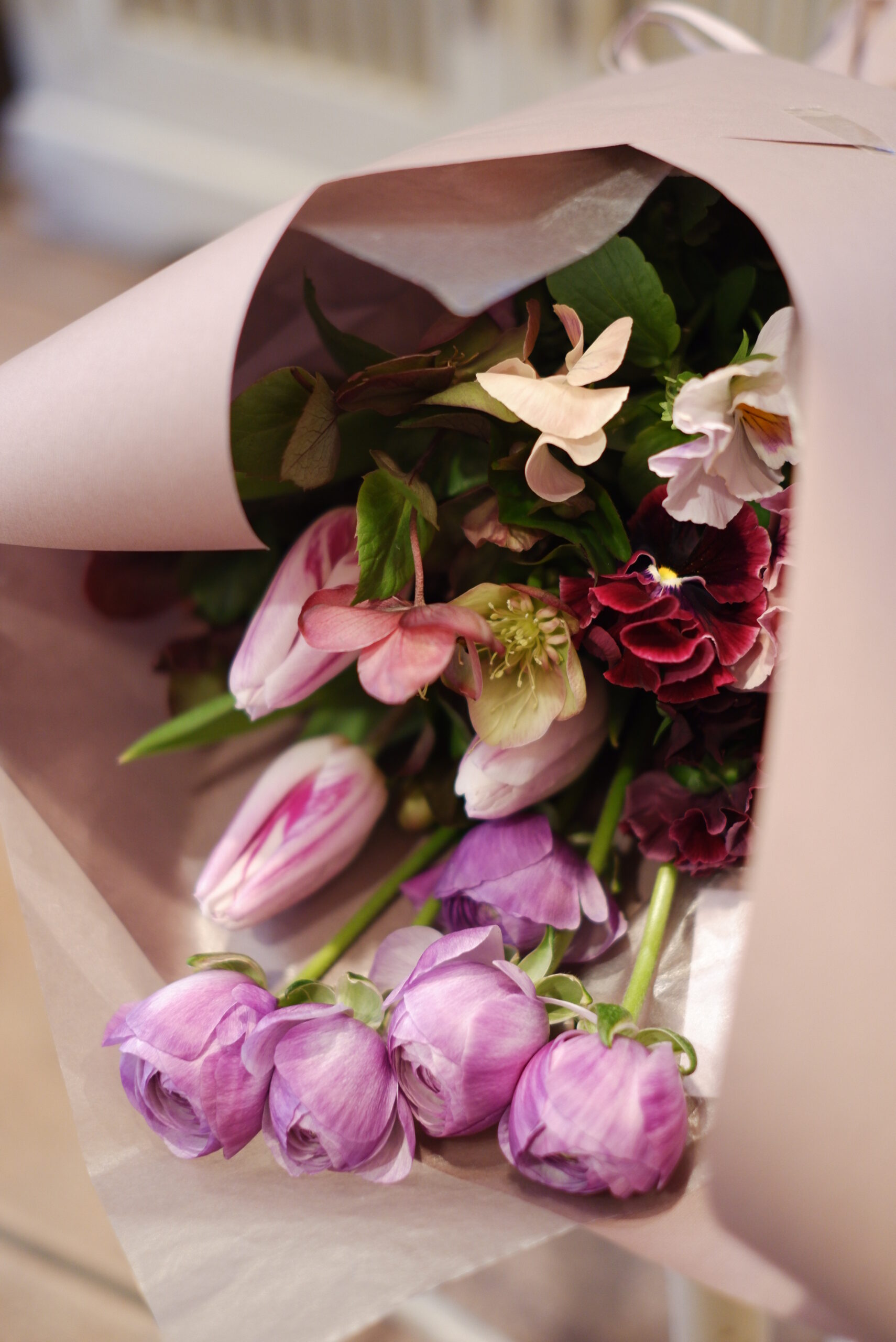 紫色のお花が大好きな方と伺い、ラナンキュラスやパンジー、クリスマスローズなどをさっと束ねて、