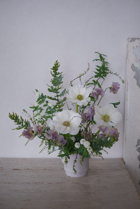 ひとつひとつの花材をじっくりと見極めながら作られた作品は