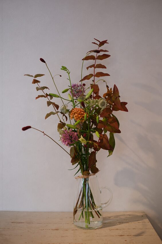 茶色に紅葉したヒペリカムの枝、ケイトウ「エビブラウン」、アジアティックリリー「プチブラン」、アリウム「オータムパープル」などなど