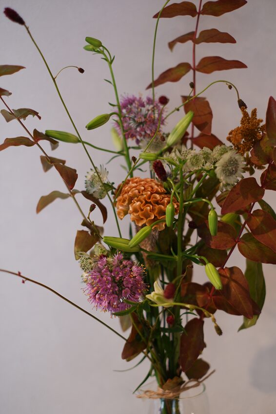 茶色に紅葉したヒペリカムの枝、ケイトウ「エビブラウン」、アジアティックリリー「プチブラン」、アリウム「オータムパープル」などなど