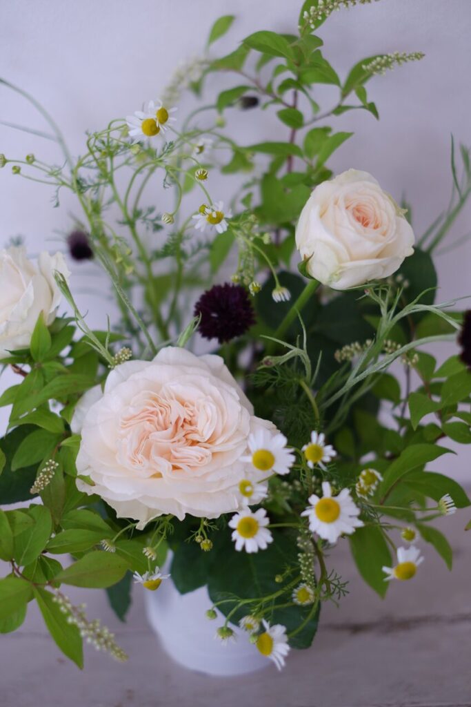 お花のアレンジは初めてとのことで、とくに茎の細い矢車草をオアシスに挿すのに少し苦労されていましたが、完成した作品をカメラ越しに見ると、全体のバランスがとても良く、矢車草もリズムよく凹凸をつけて配置されていました