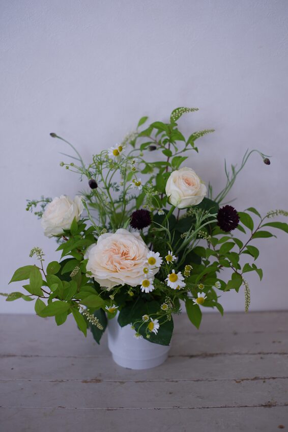 お花のアレンジは初めてとのことで、とくに茎の細い矢車草をオアシスに挿すのに少し苦労されていましたが、完成した作品をカメラ越しに見ると、全体のバランスがとても良く、矢車草もリズムよく凹凸をつけて配置されていました