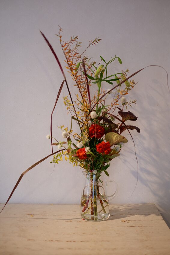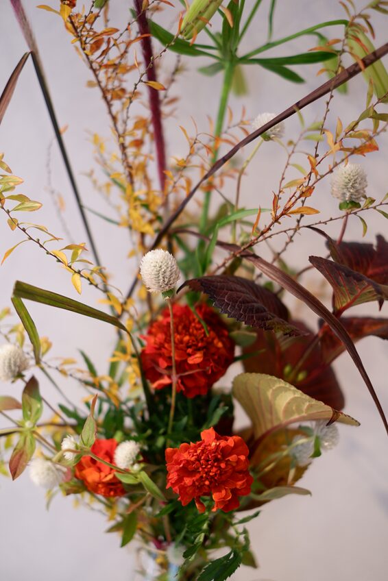 今日は、赤から黄色へと紅葉した雪柳、赤茶色に色づいた紫陽花の葉、紅葉した千日紅、パープルファウンテングラスなど、秋らしい花材を使い、白いアジアンリリー「スイートサレンダー」やマリーゴールドを合わせ、白とブラウン系で落ち着いた色調の花束を束ねていただきました