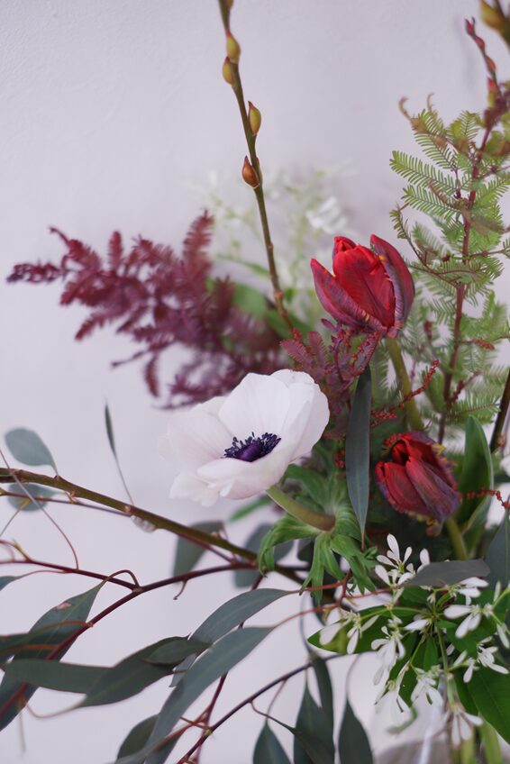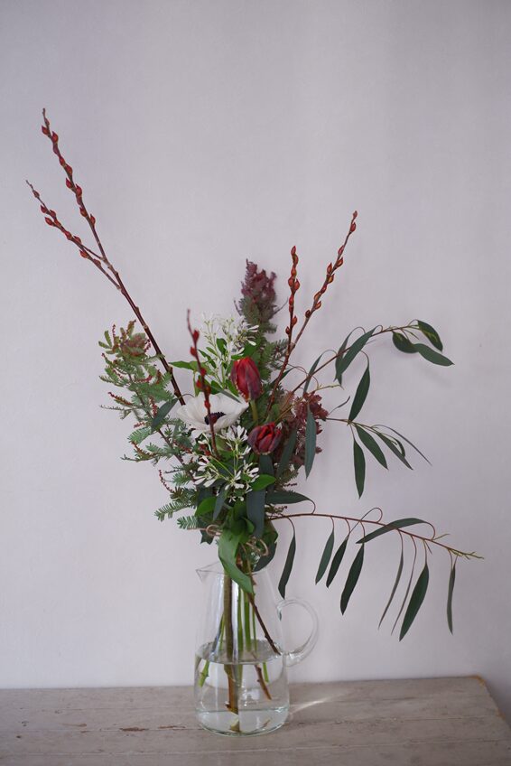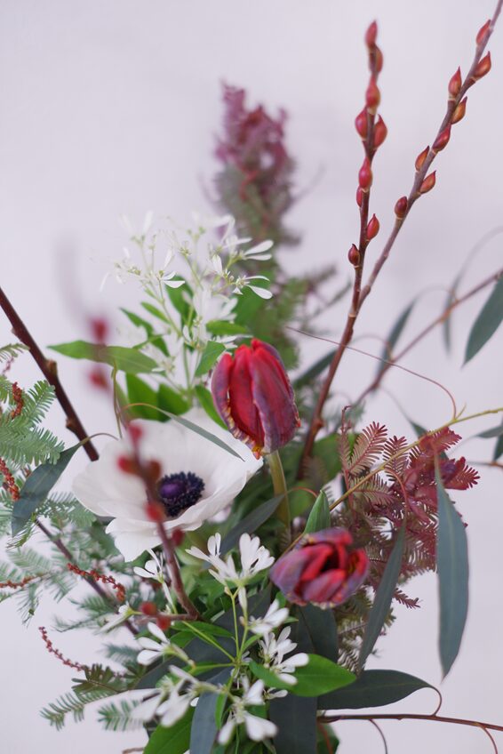 赤目柳の枝は、手の腹でしならせ、やわらかい茎のチューリップやアネモネに寄り添わせて