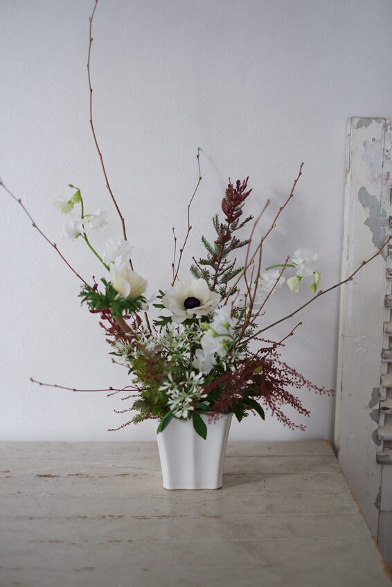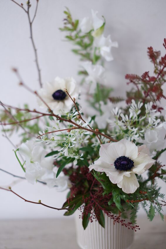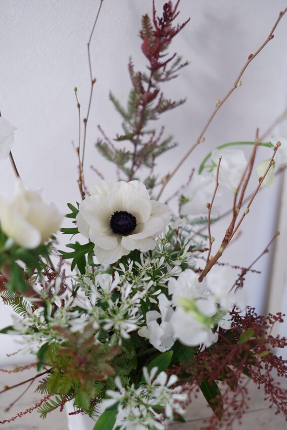 それぞれ、ヒメミズキの枝の動きを生かしながら、メインのアネモネやスイートピーなど、春のお花を活けていきます