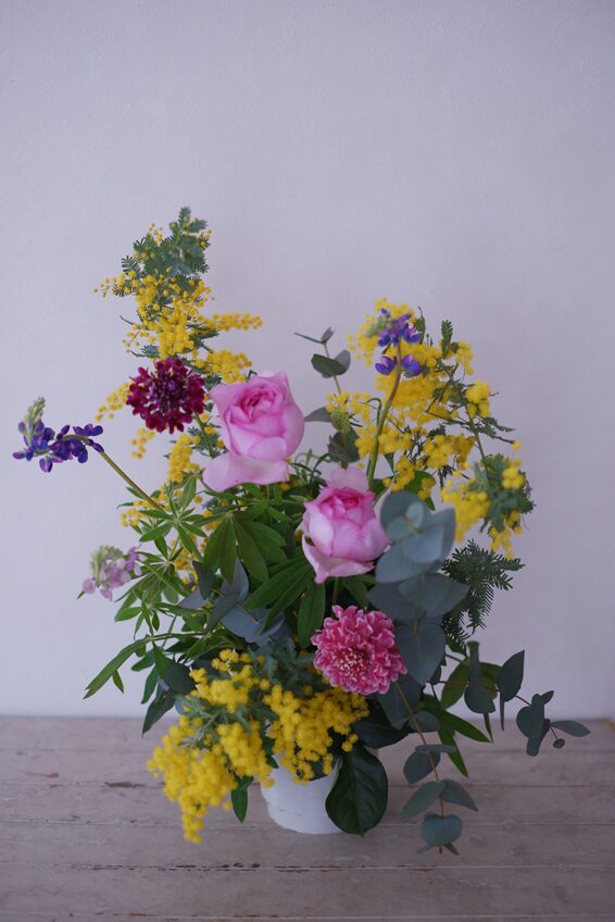 ミモザと、オールドローズ咲きのバラ「フレジェ」を合わせると