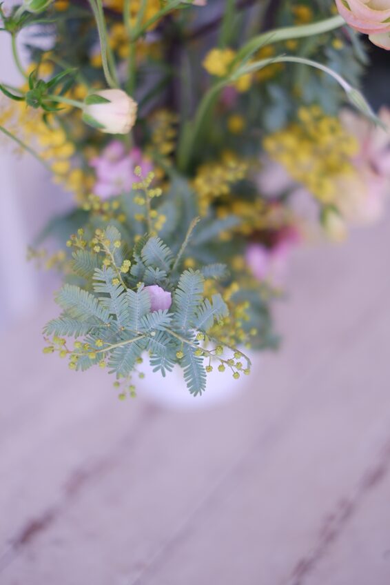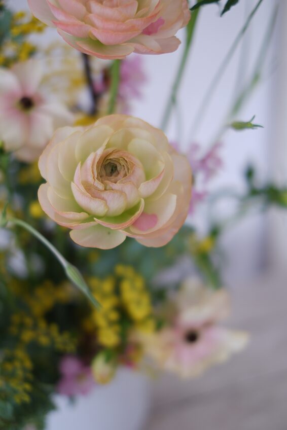 仕上げに、枝からこぼれた桜の花びらをラナンキュラスやミモザにそっとのせて♡