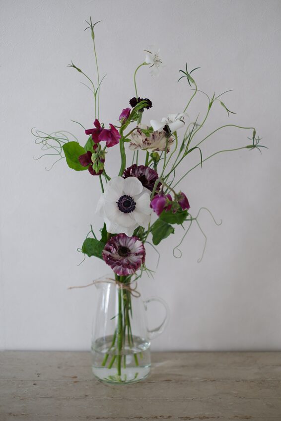 ラナンキュラスやアネモネ、枝のスイートピー・・あえて草花だけをモノトーンで束ねていただきました