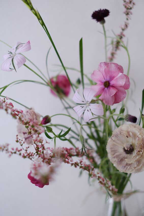 レッスン今日は、ピンクの雪柳にラナンキュラスラックス、矢車草、イキシアなど、