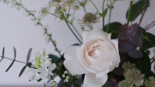 花材:ラナンキュラス、ラナンキュラスラックス、アリウムガーデンスプリング、ヤグルマギク、クリスマスローズ、グミ