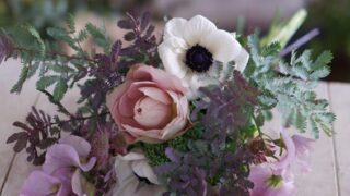 花材:ラナンキュラス、ヤグルマギク、スモークグラス、ボリジ、バラオリエンタルエクレール、ハーブゼラニウム