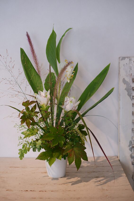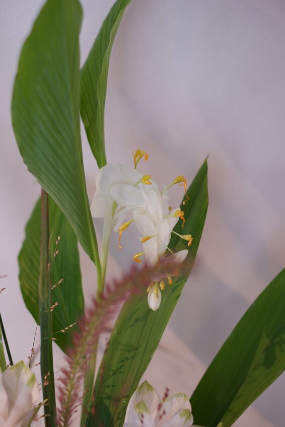 本日のテーマは、珍しいお花「グロッパ・ホワイトドラゴン」と「クルクマ」をポイントに、