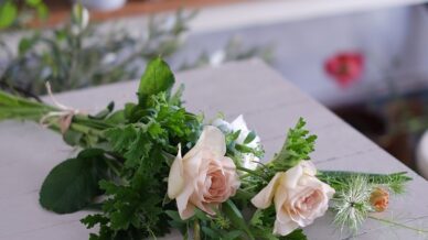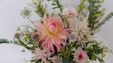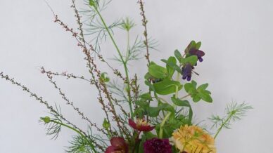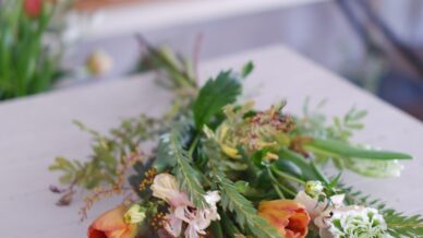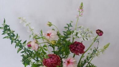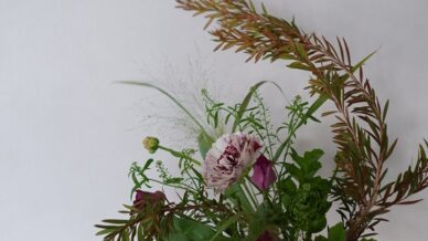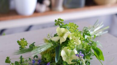 花材:スカビオサ、ラナンキュラス、クリスマスローズ、スイートピー、ムギ、セリンセ