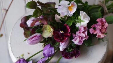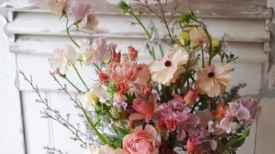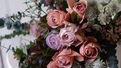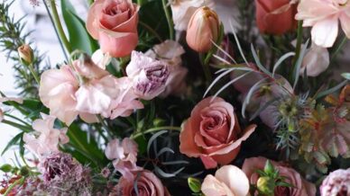 お悔やみの気持ちを、カフェラテ色のバラと季節の花々に寄せて・・季節のアレンジメントや花束、入荷情報は、「Diary」でご紹介しています